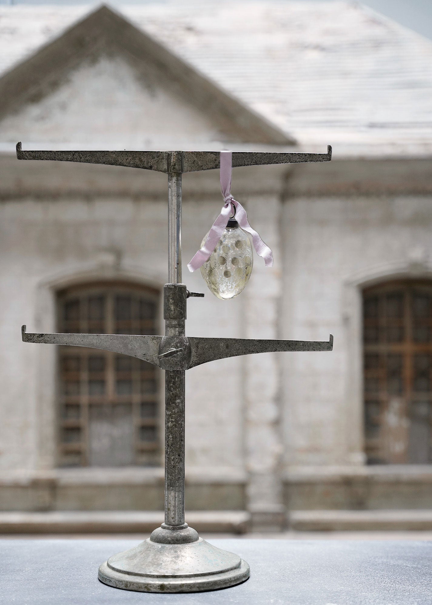 Weihnachtskugel Nr. 10, ovale Form, Silber, mit goldenen Punkten