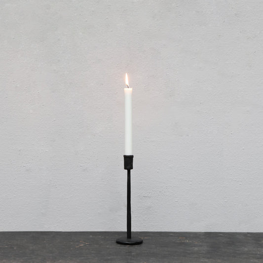 Minimalistischer Kerzenhalter aus Eisen mit geschwärztem, rustikalem Finish. Der Kerzenständer ist in drei Größen erhältlich, die beliebig kombiniert werden können.
