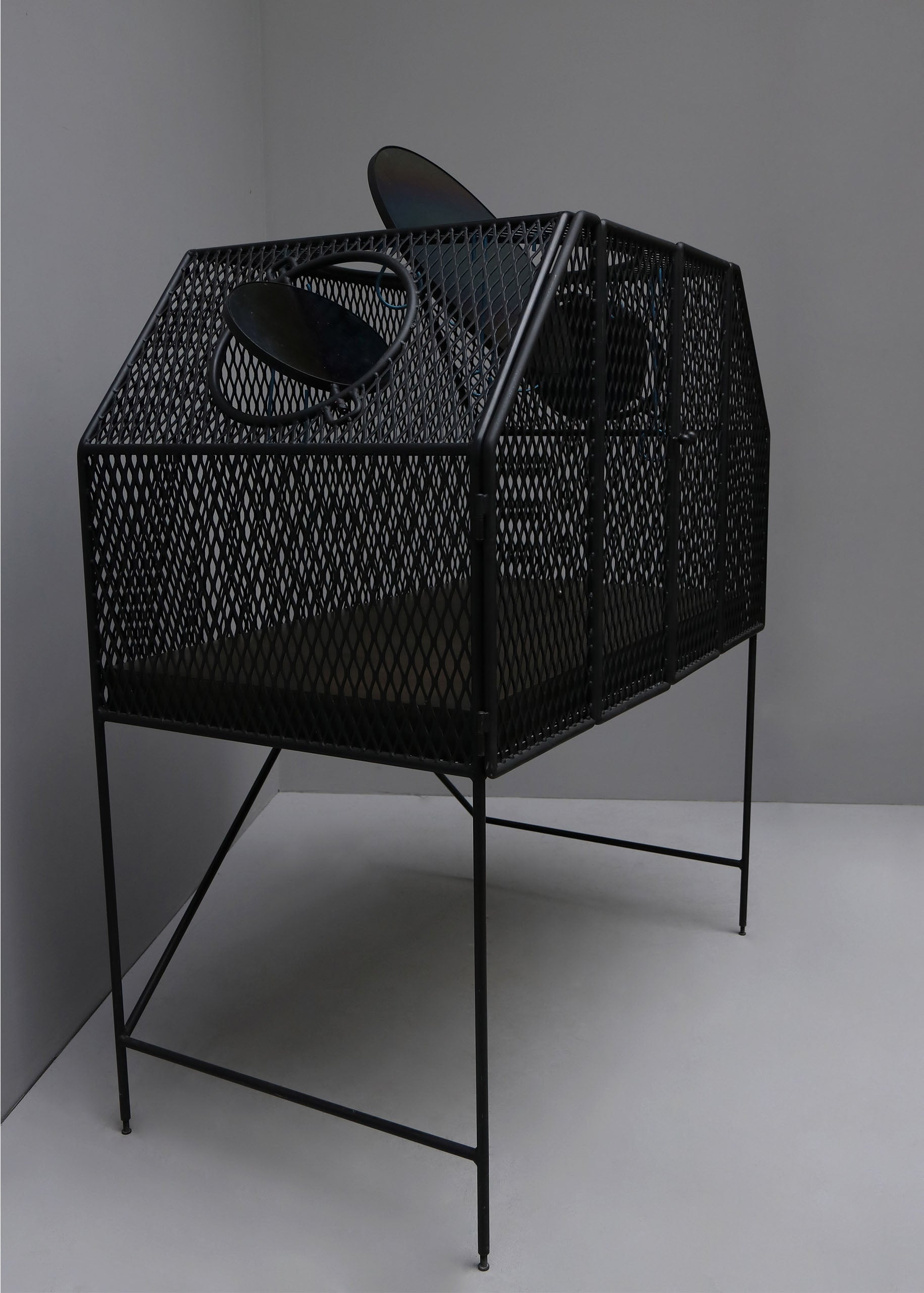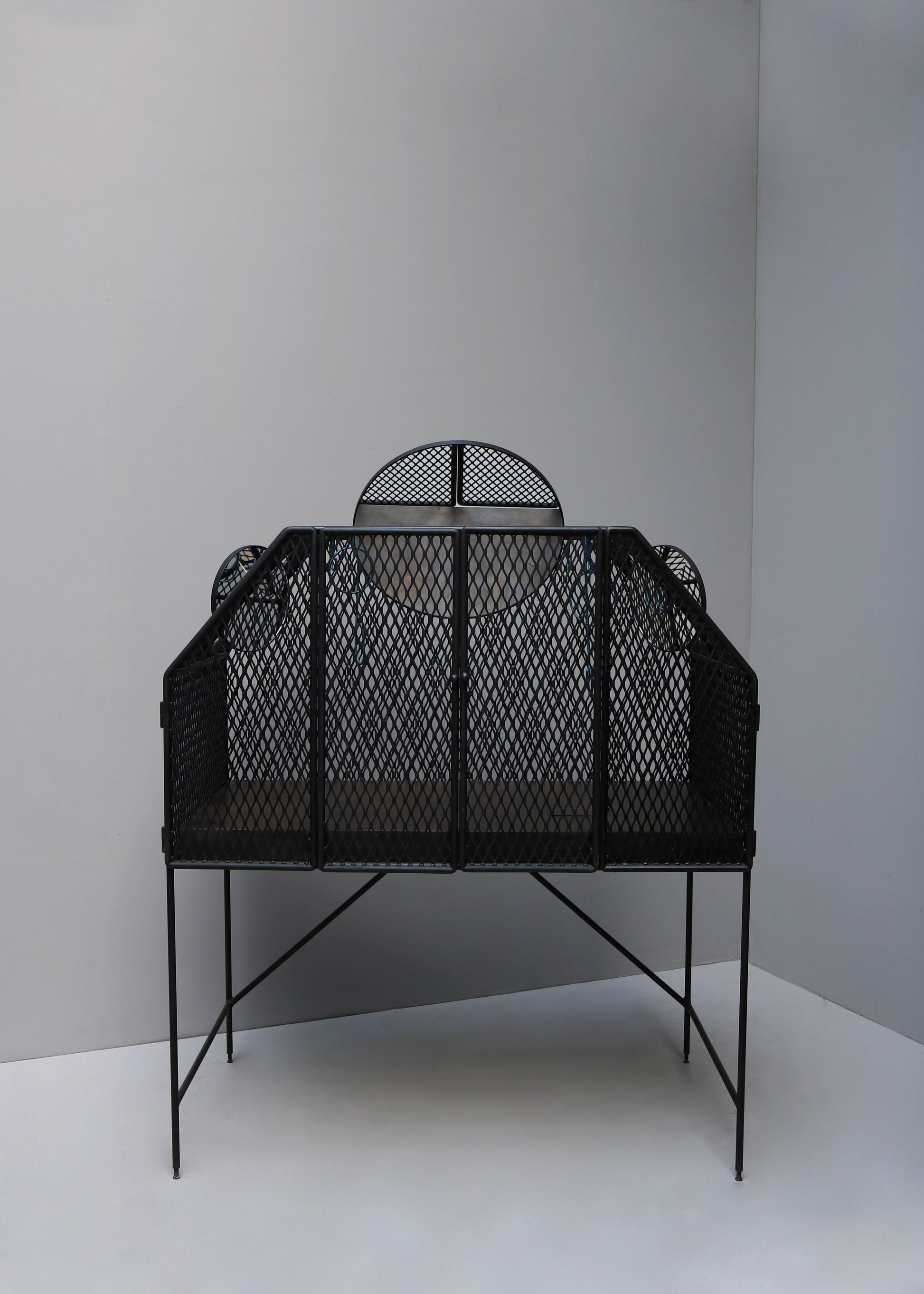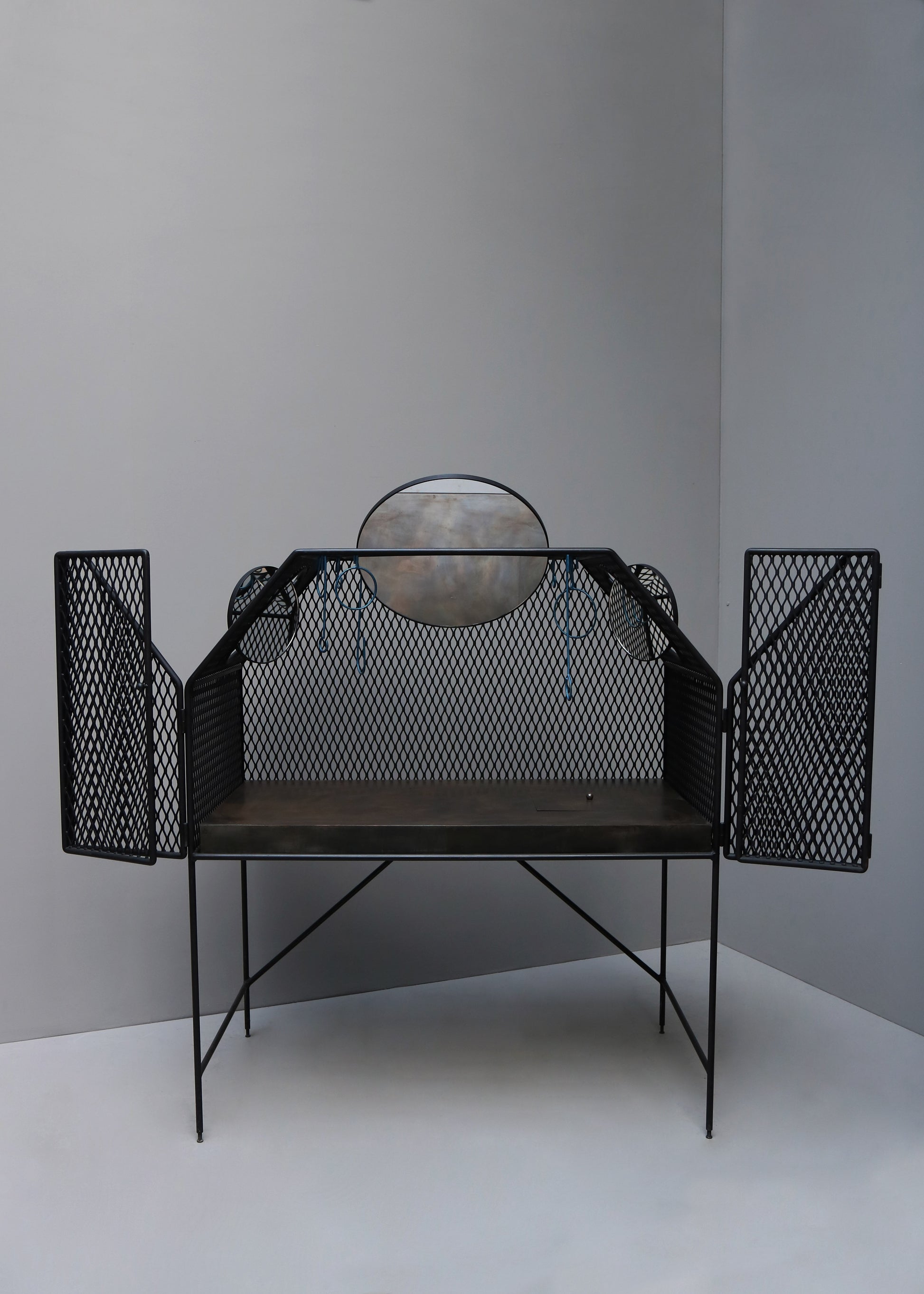 Schminktisch von Faye Toogood. Stahl, patiniertes Netz, Spiegel, schillerndes Glas. Aus dem Jahr 2011. Hergestellt in einer Auflage von 8 + 2AP.