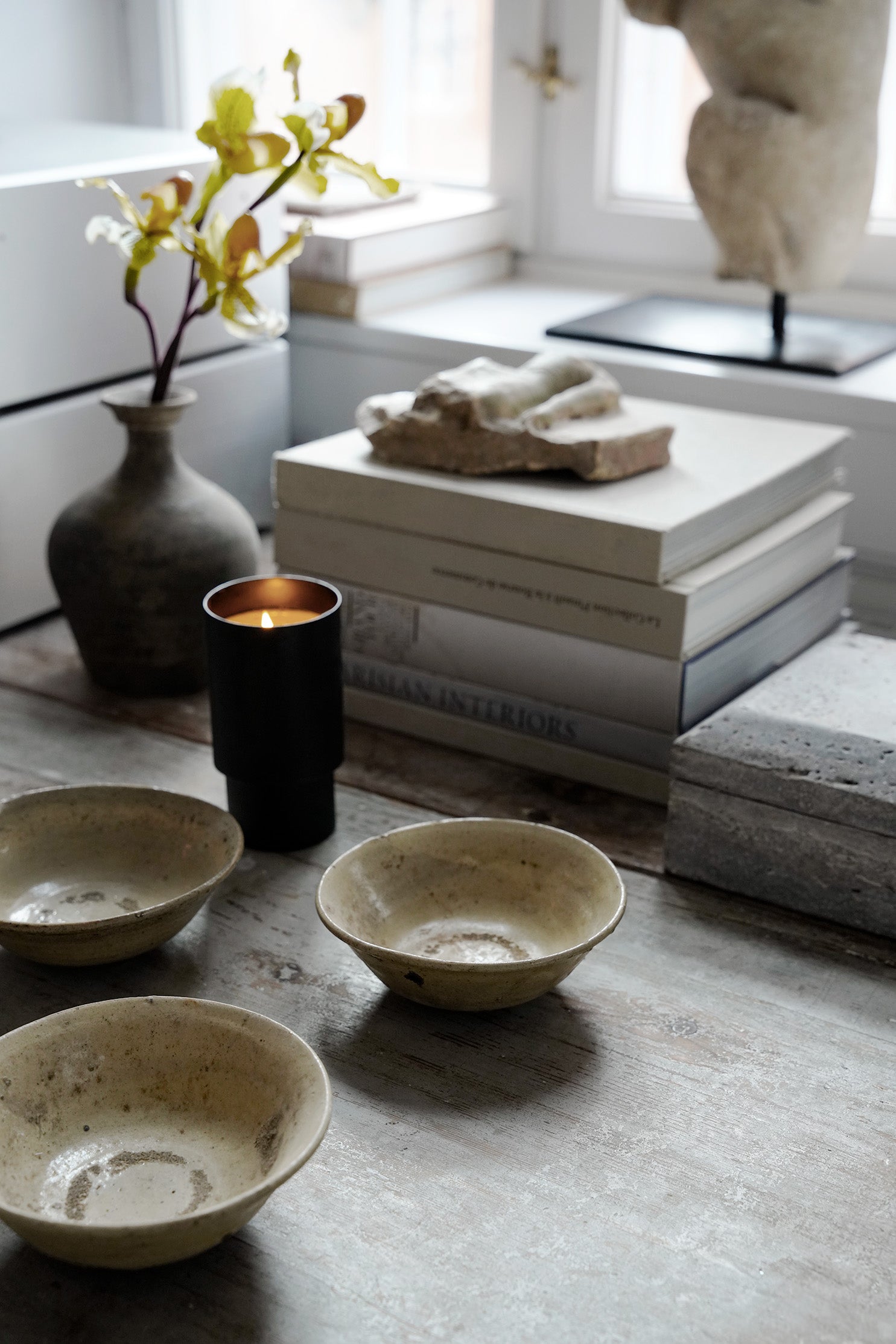 Alte handgefertigte Keramikschalen mit wunderschönem gelben Glas. Die Objekte sind alle Unikate und variieren daher leicht in Aussehen und Farbe. Sie alle haben eine schöne Patina, die ihnen ein antikes Aussehen verleiht.