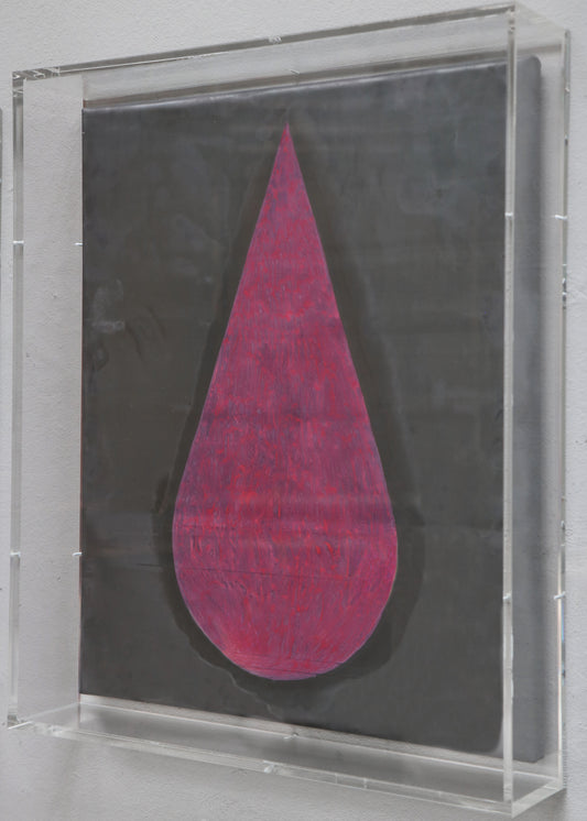 Sailstorfer verwendet Lippenstift als Medium, um die rätselhafte Form auf eine Bleioberfläche zu übertragen. Als ultimatives Symbol für emotionalen Ausdruck, sowohl männlich als auch weiblich, verschmilzt die Träne chemisch mit der Metalloberfläche, die dem Künstler als Leinwand dient.