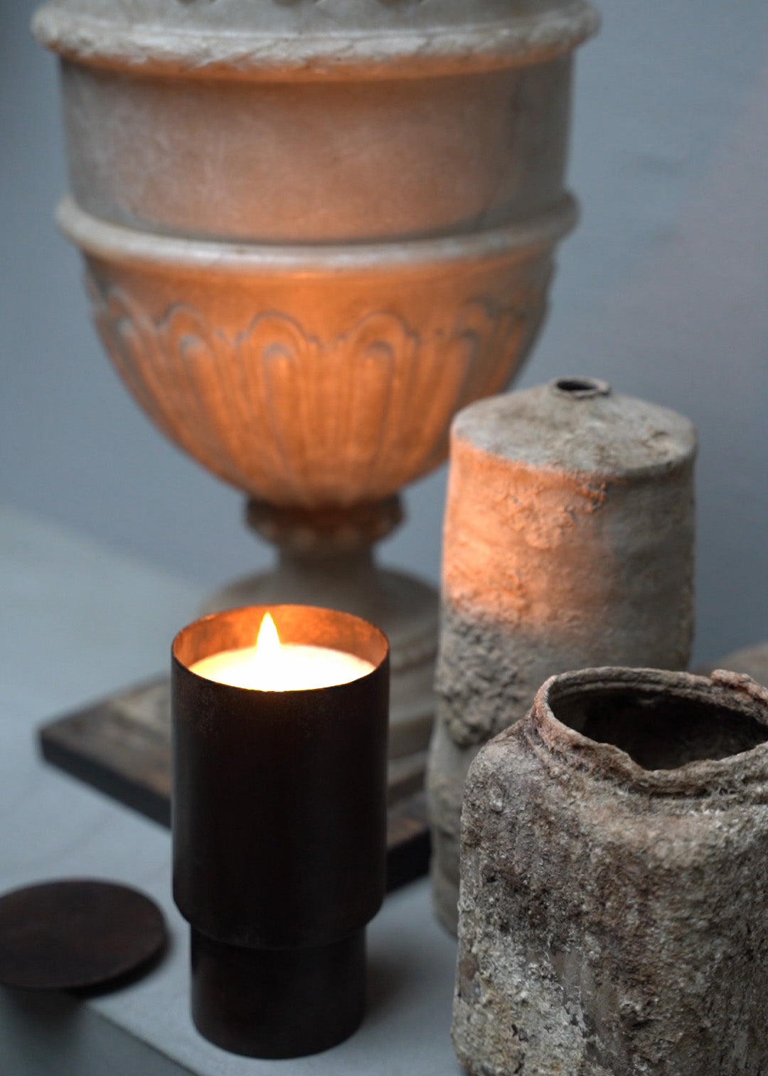Die Kerze wird in einem Eisengefäß mit Deckel geliefert und kann als Vase oder nach dem Abbrennen so verwendet werden.