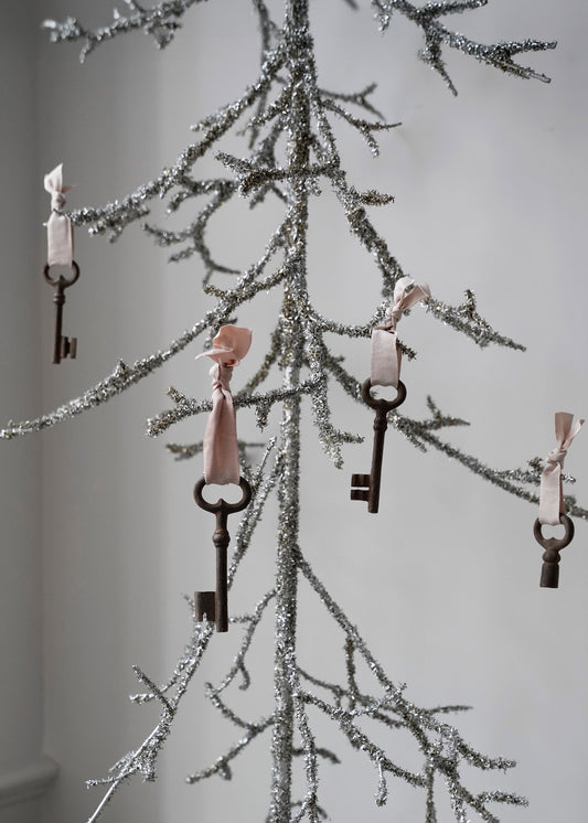Rusty Key-Ornament mit einem handgefärbten beerenfarbenen Band.