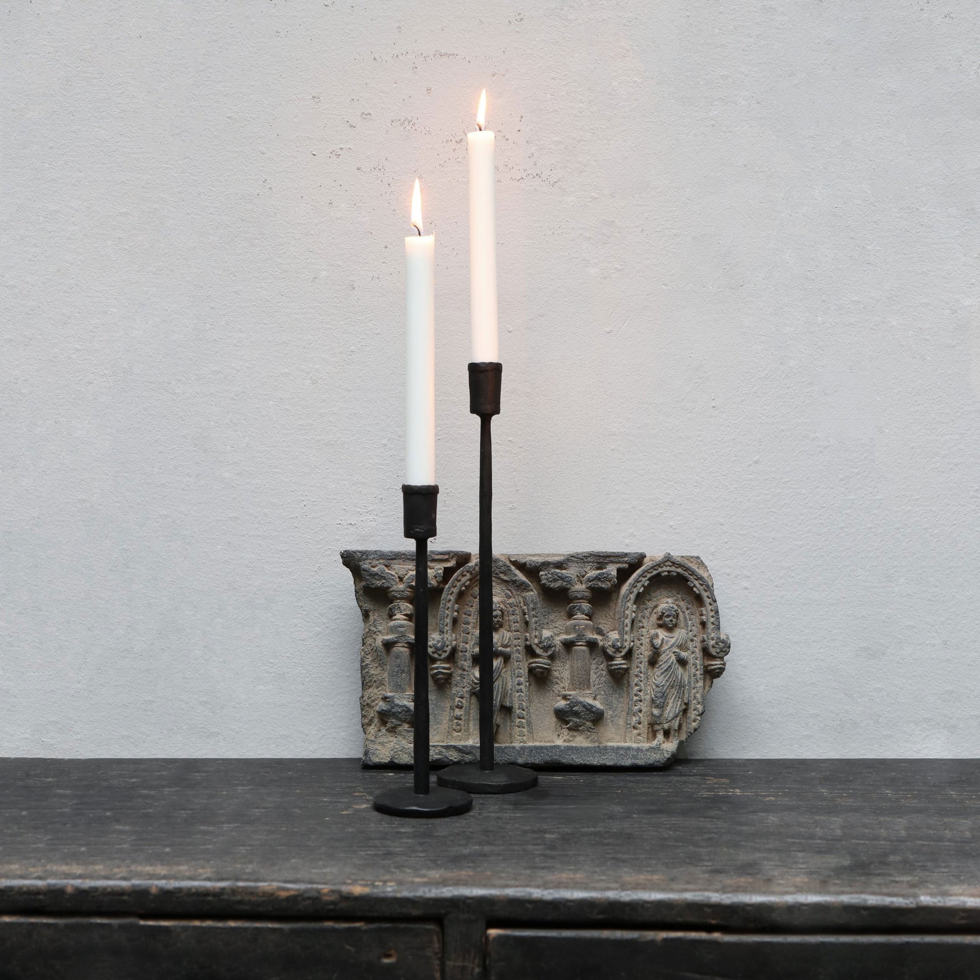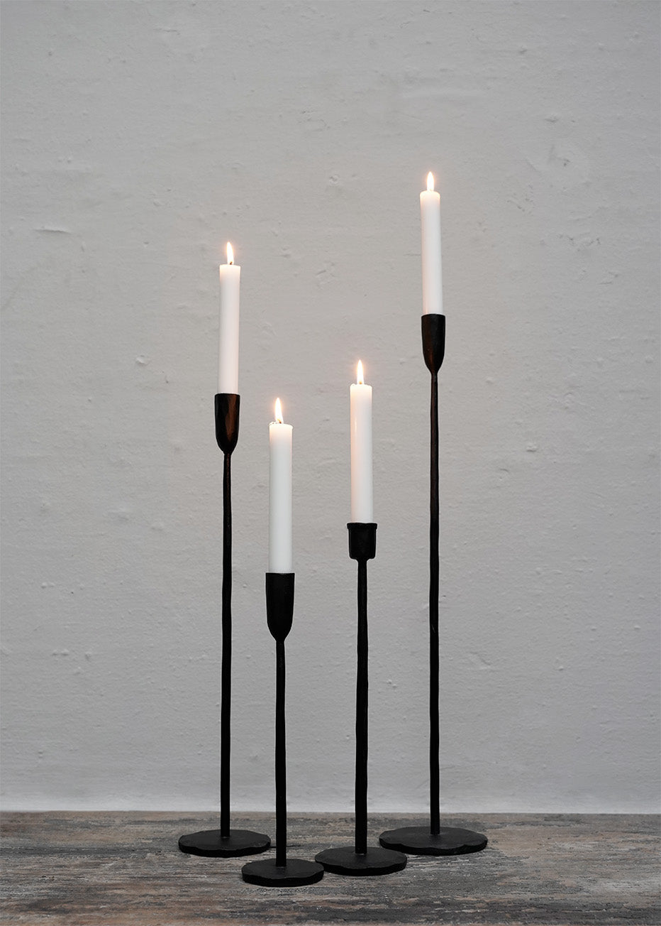 Slim and minimalistic iron candle holder with a blackened and rustic finish.