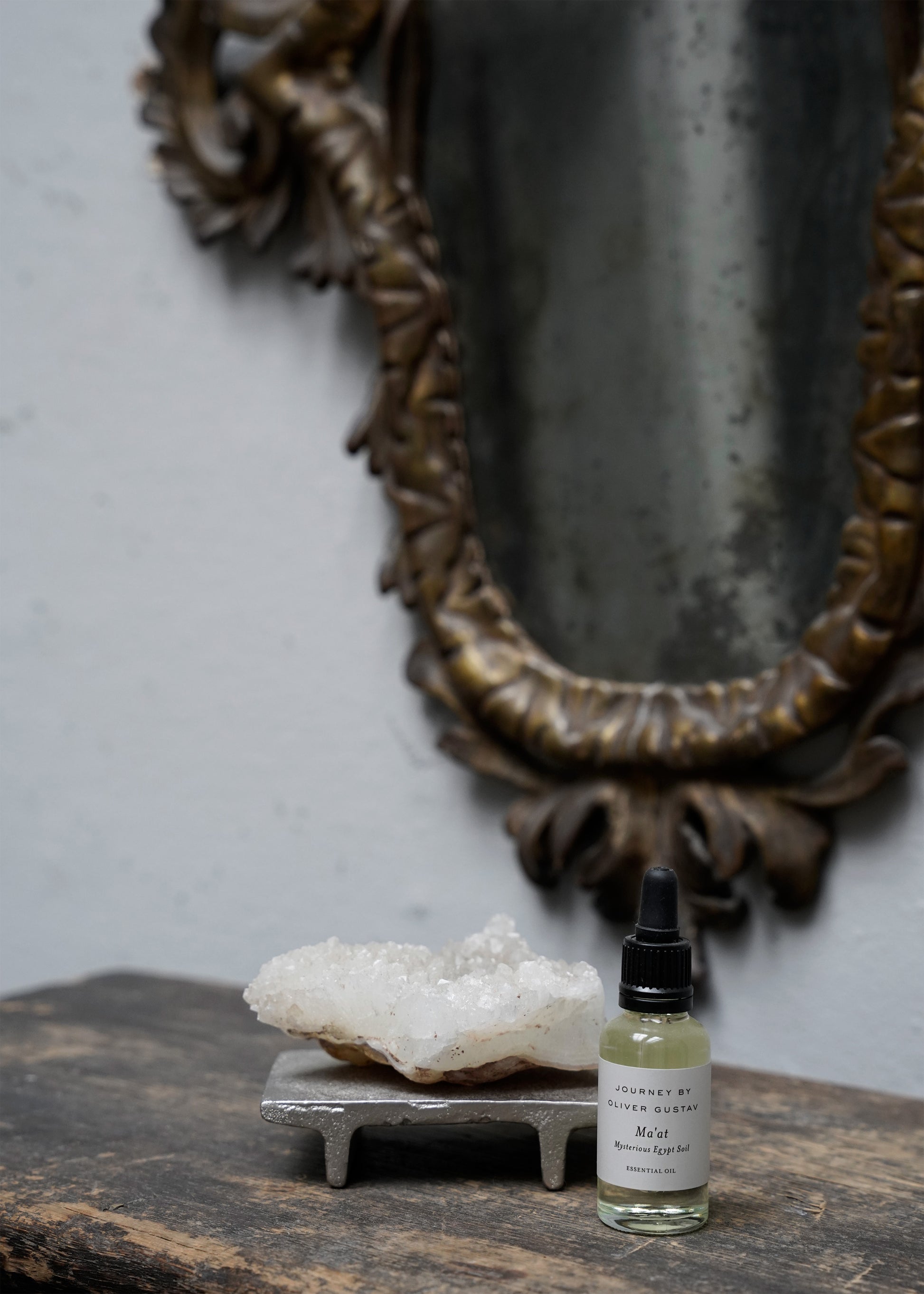 The Journey by Oliver Gustav Agate Crystal is placed on a silvery metal stand, enhancing the stone’s captivating shapes and delicate, translucent hues. The fine addition of drops of the accompanying Ma'at essential oil will infuse your rooms with a soft sense of serenity and freshness.