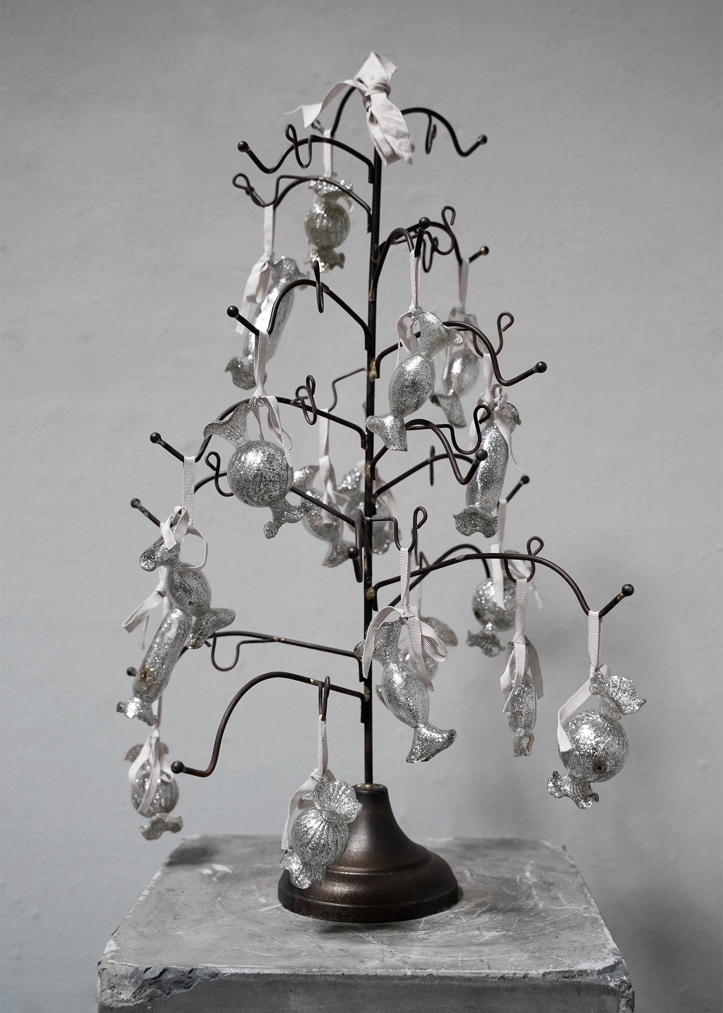Candy ornament in silver glitter with an antique finish, adorned with a hand dyed pink ribbon.