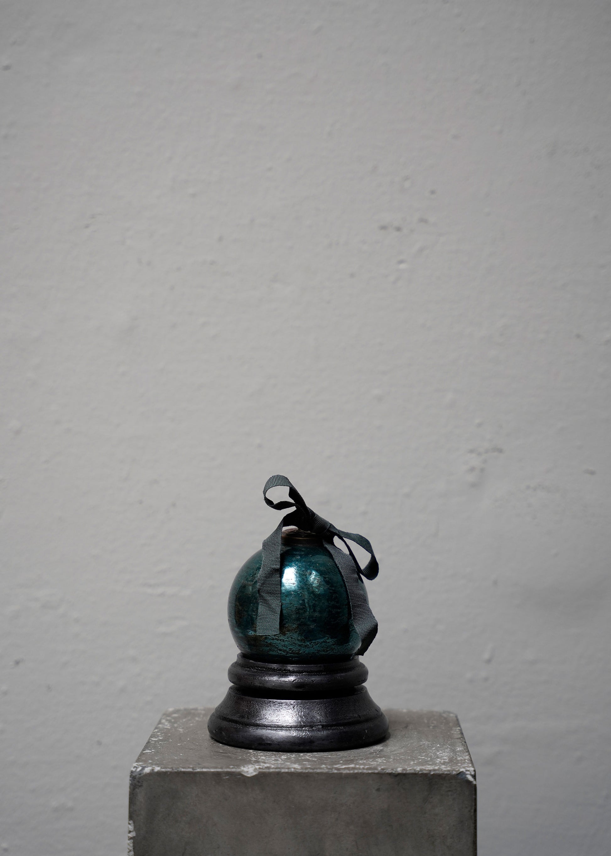 A beautiful enameled bauble in the color peacock - a vibrant mix of blue and green with a hint of turquoise. Adorned with a hand-dyed ribbon in green.