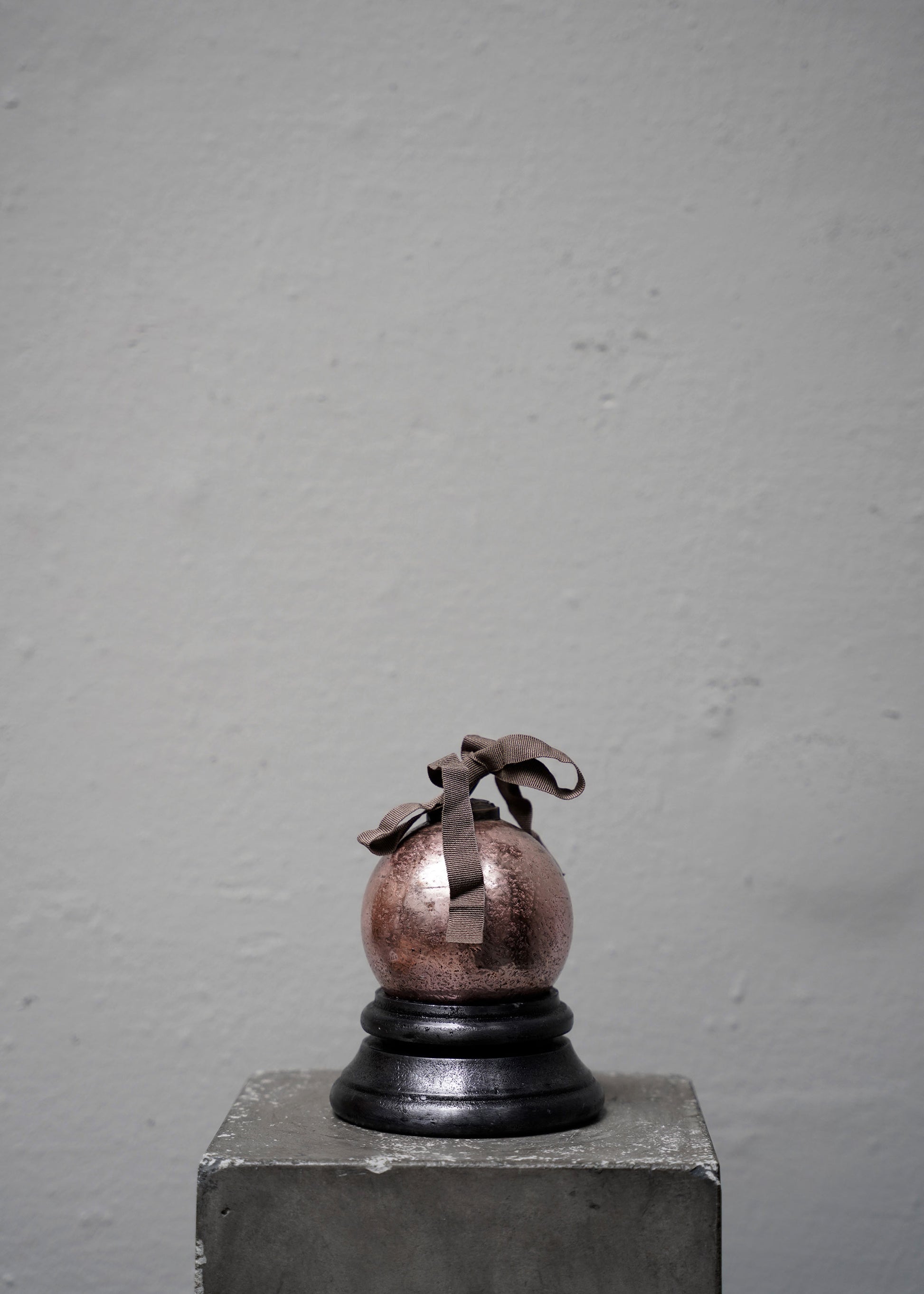 A beautiful enameled bauble in pink, adorned with a hand-dyed ribbon in a walnut color.