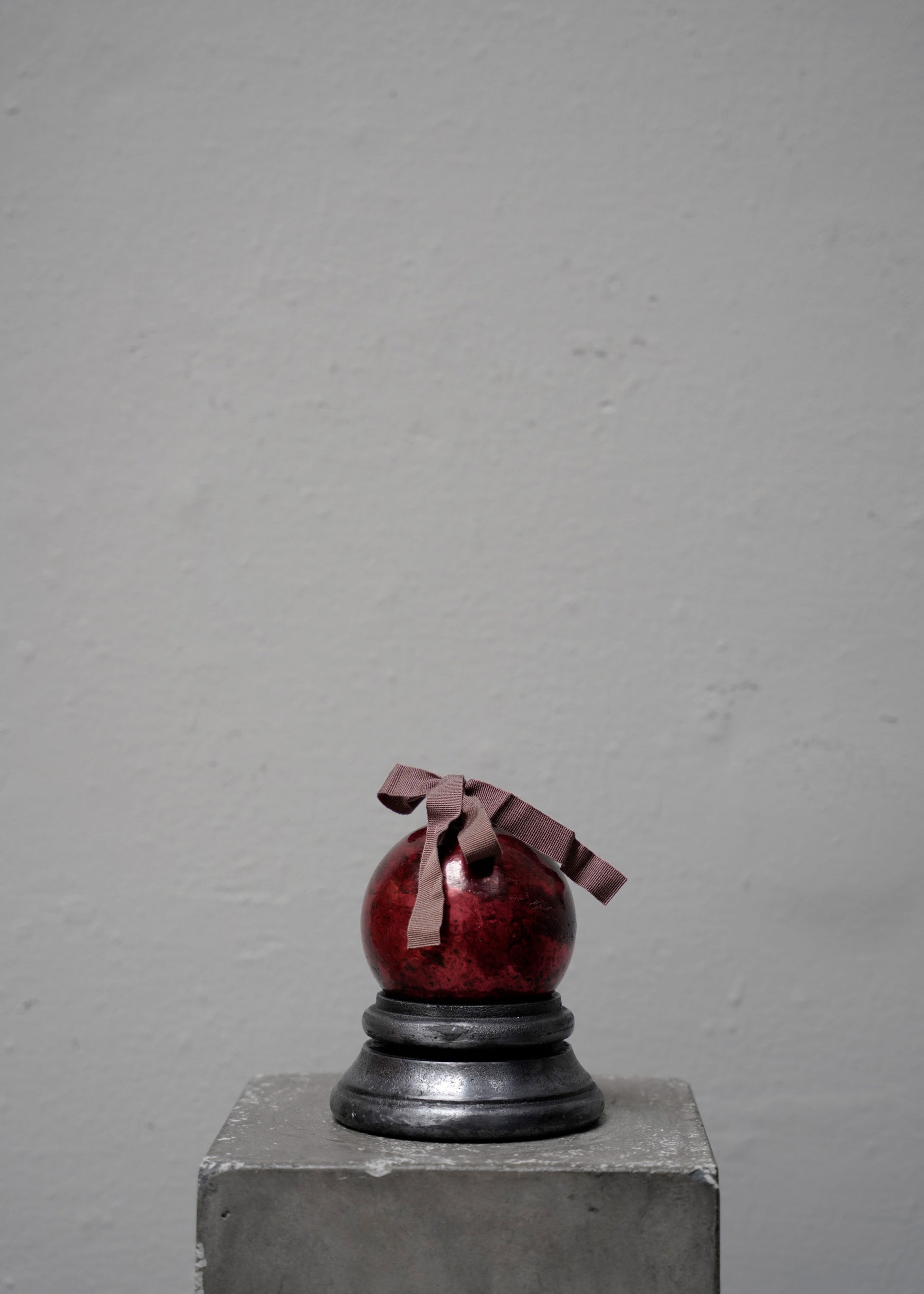 A beautiful enameled bauble in red, adorned with a hand-dyed ribbon.
