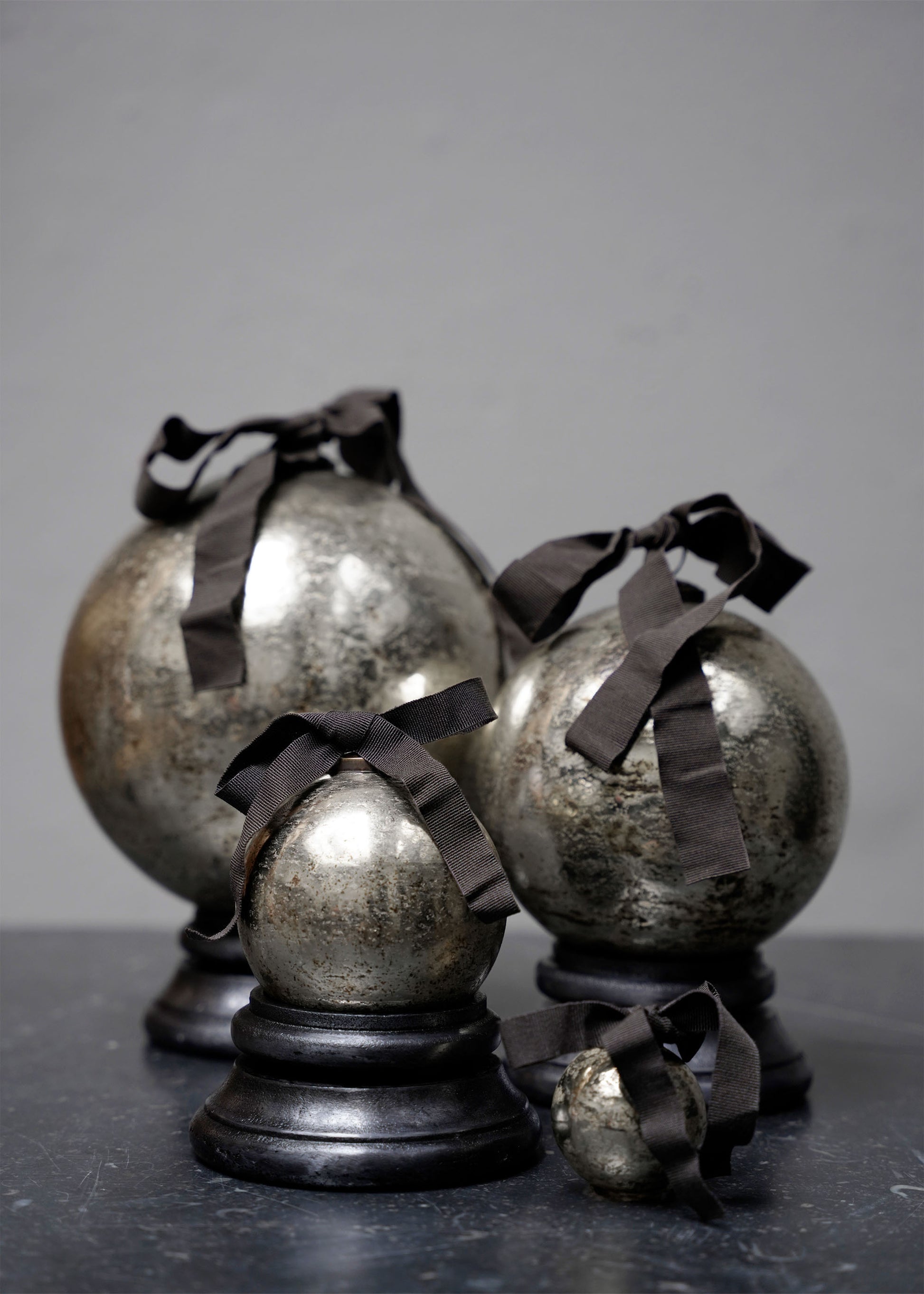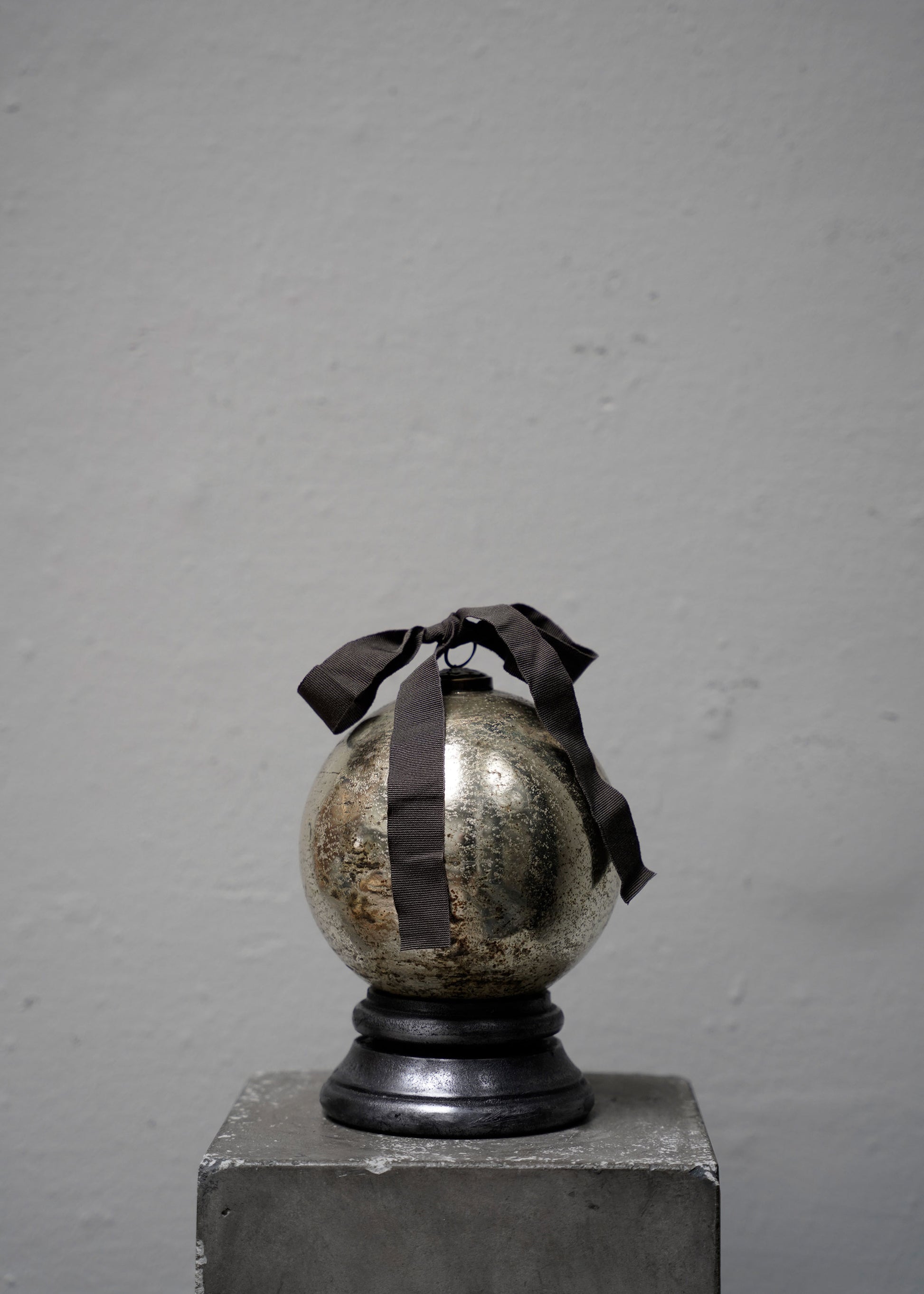 A beautiful enameled bauble in silver, adorned with a hand-dyed ribbon.