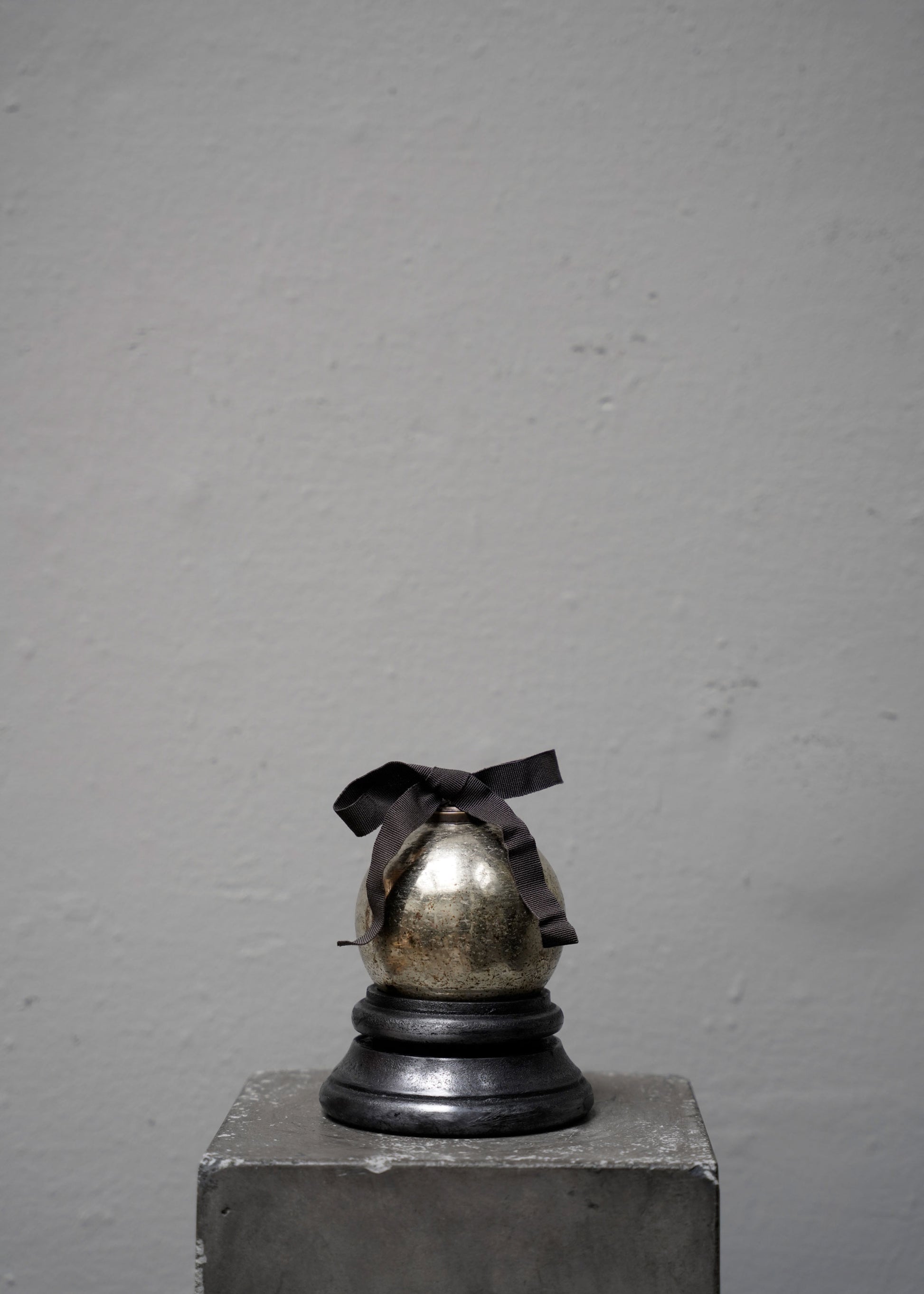 A beautiful enameled bauble in silver, adorned with a hand-dyed ribbon.