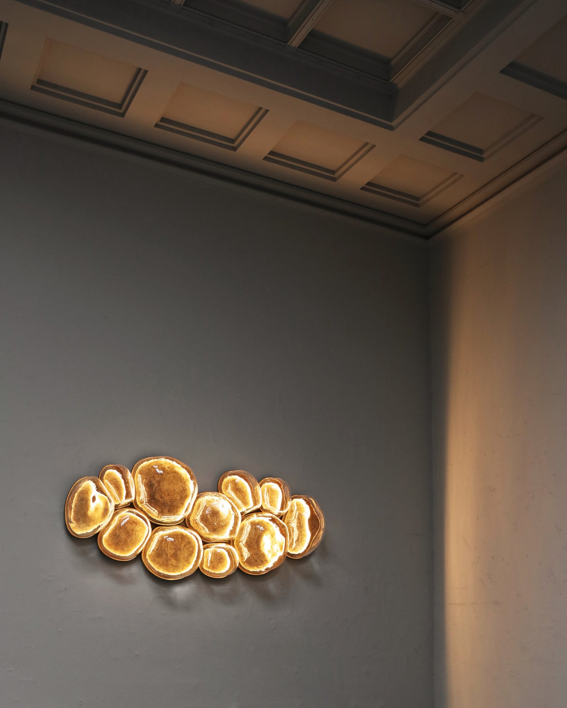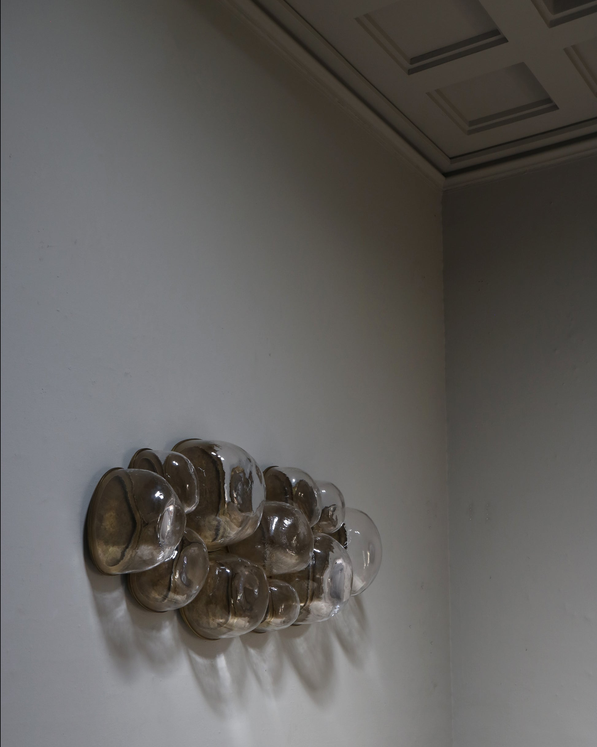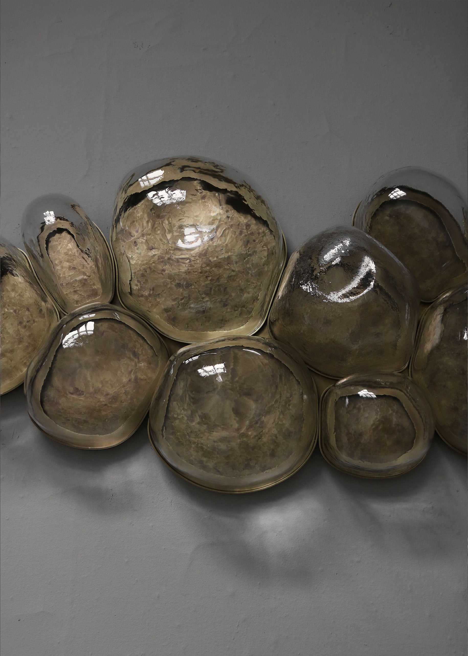 The Magma light series by EWE Studio is inspired by the volcanic universe. The volcanic stone was chosen for the molds as it is not affected by the heat of the blown glass, due to its origin. Being an artisanal process, the shape, thickness, and totality differs, as a result giving unique characteristics to each one of the Magma “bubbles”.