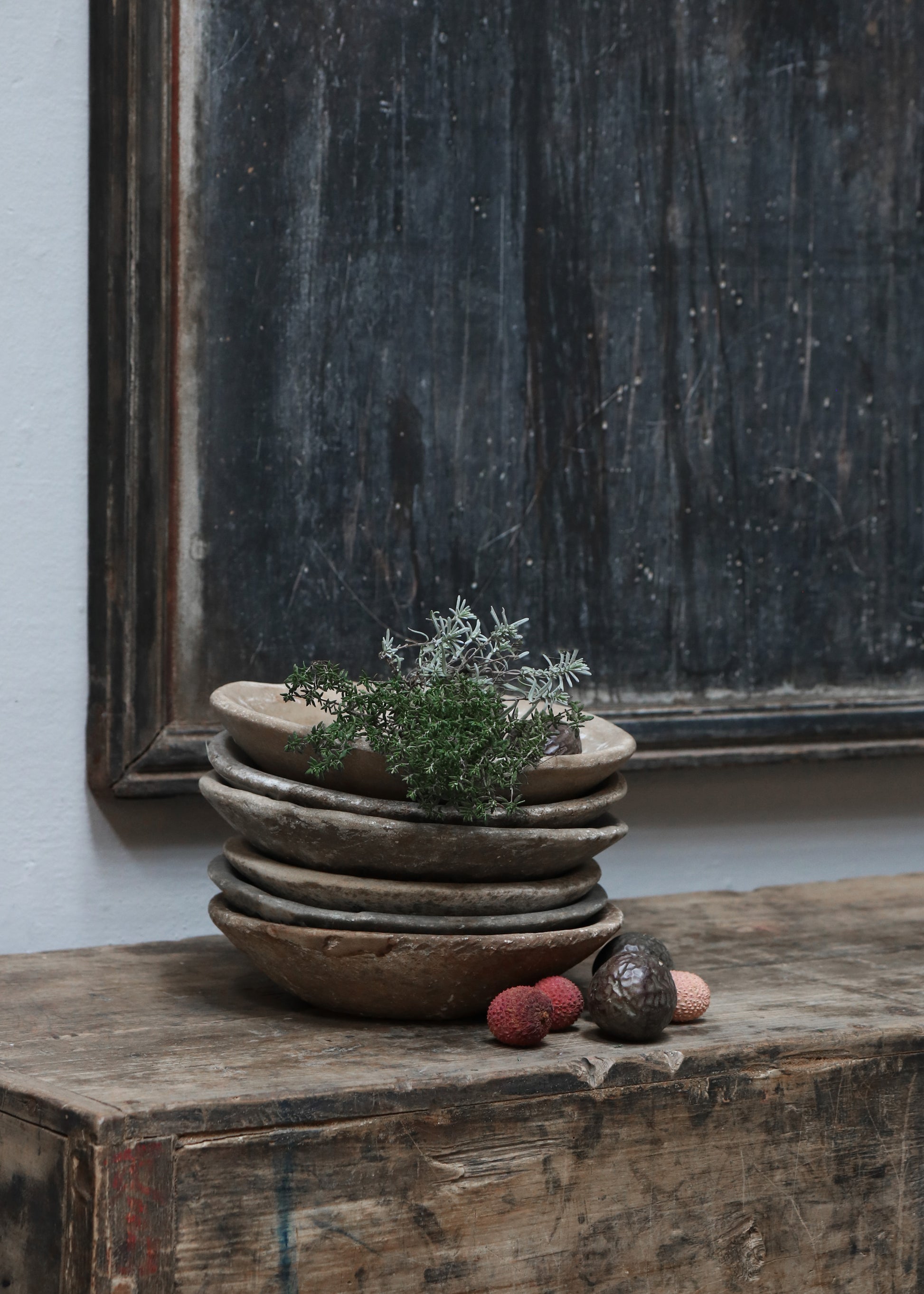One-of-a-kind bowl carved in natural stone with aged patina.