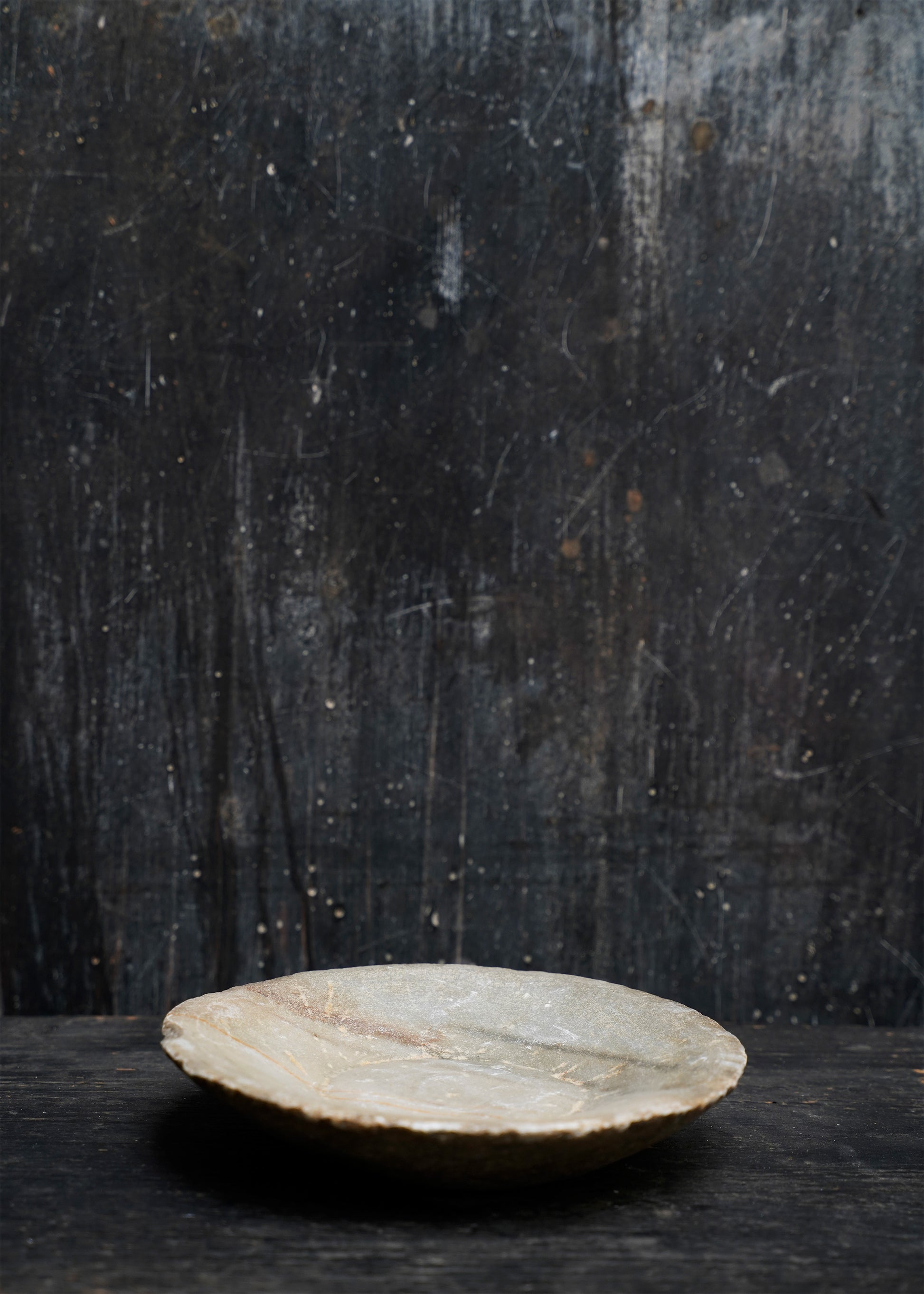 One-of-a-kind bowl carved in natural stone with aged patina.