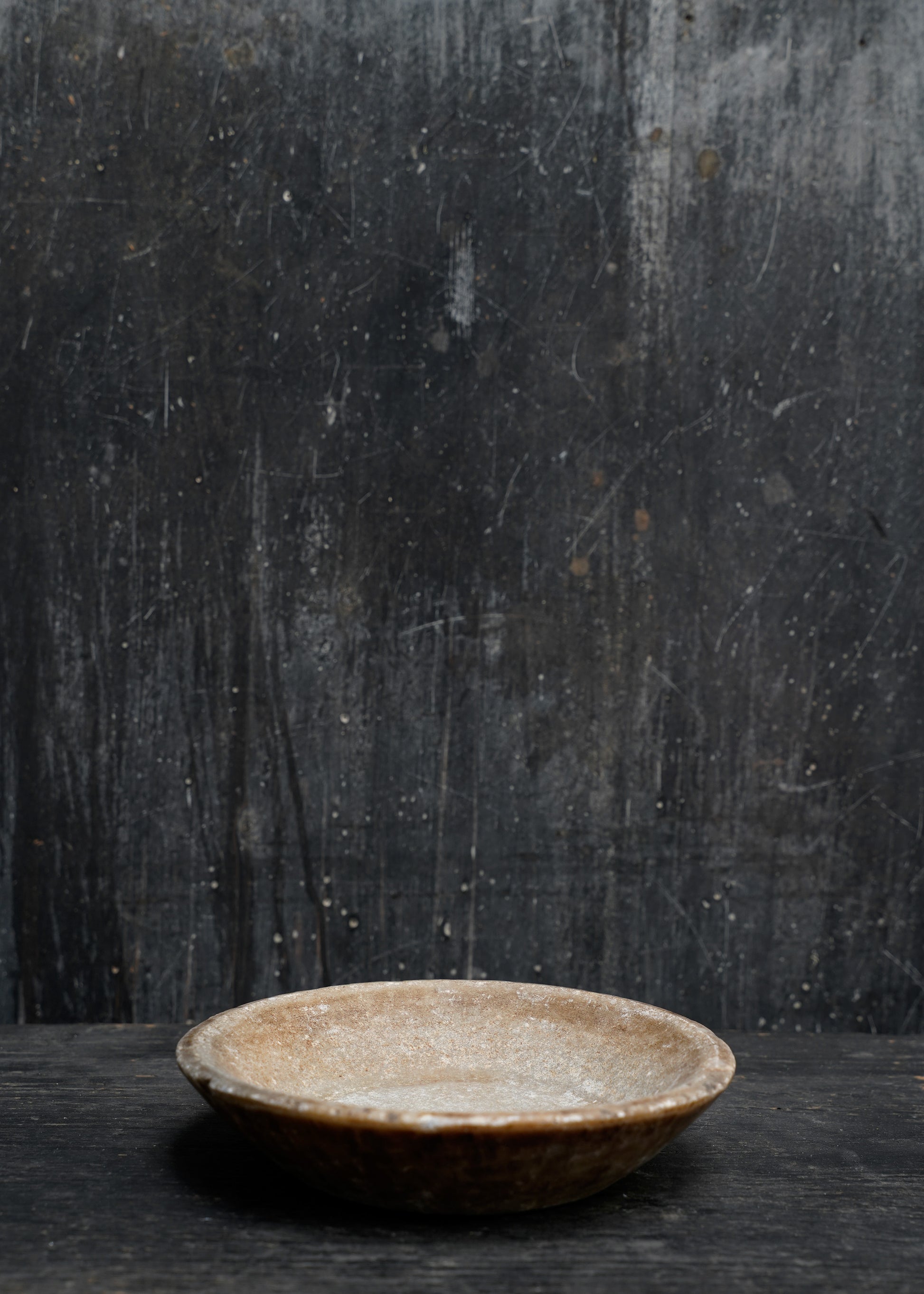 One-of-a-kind bowl carved in natural stone with aged patina.