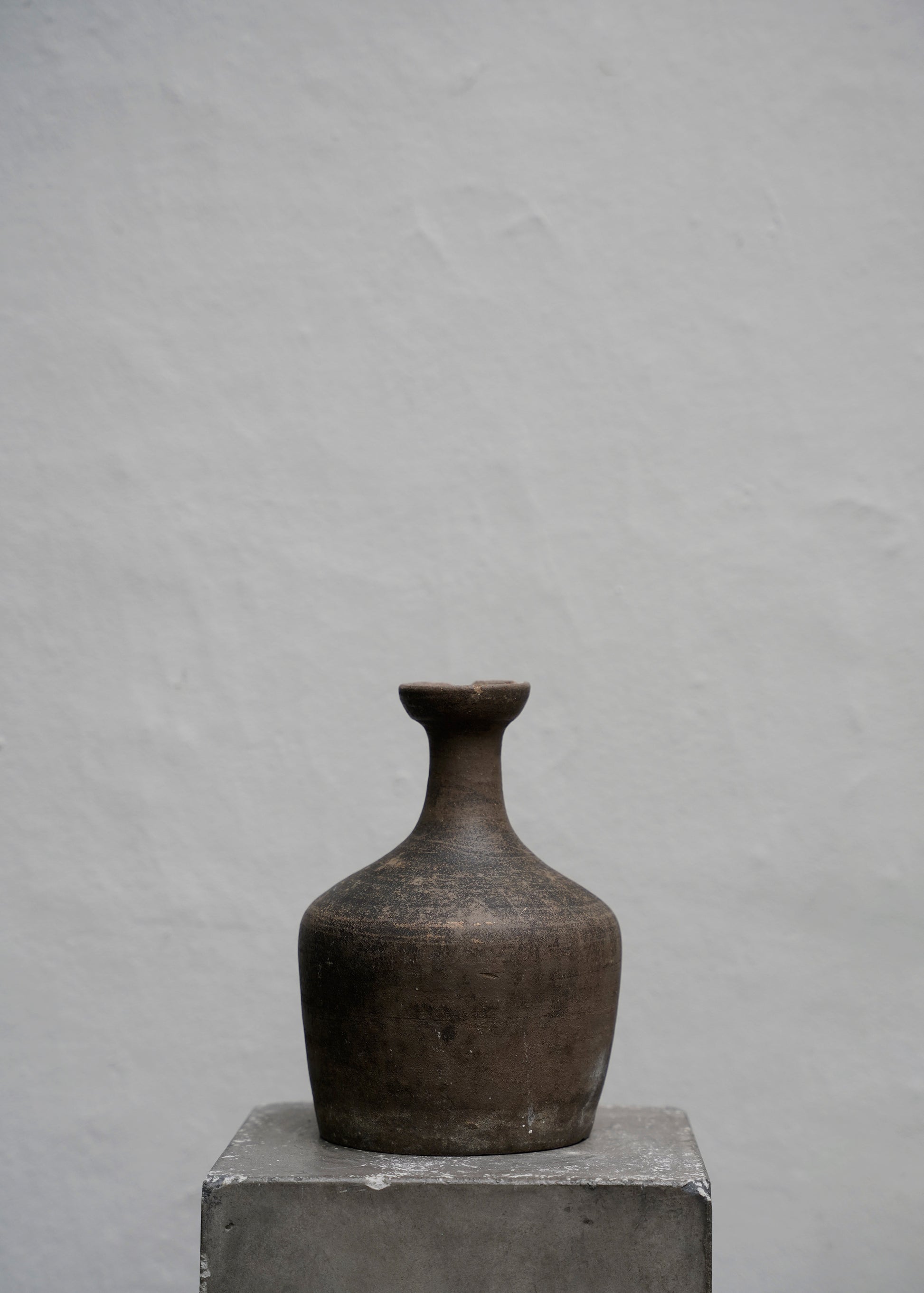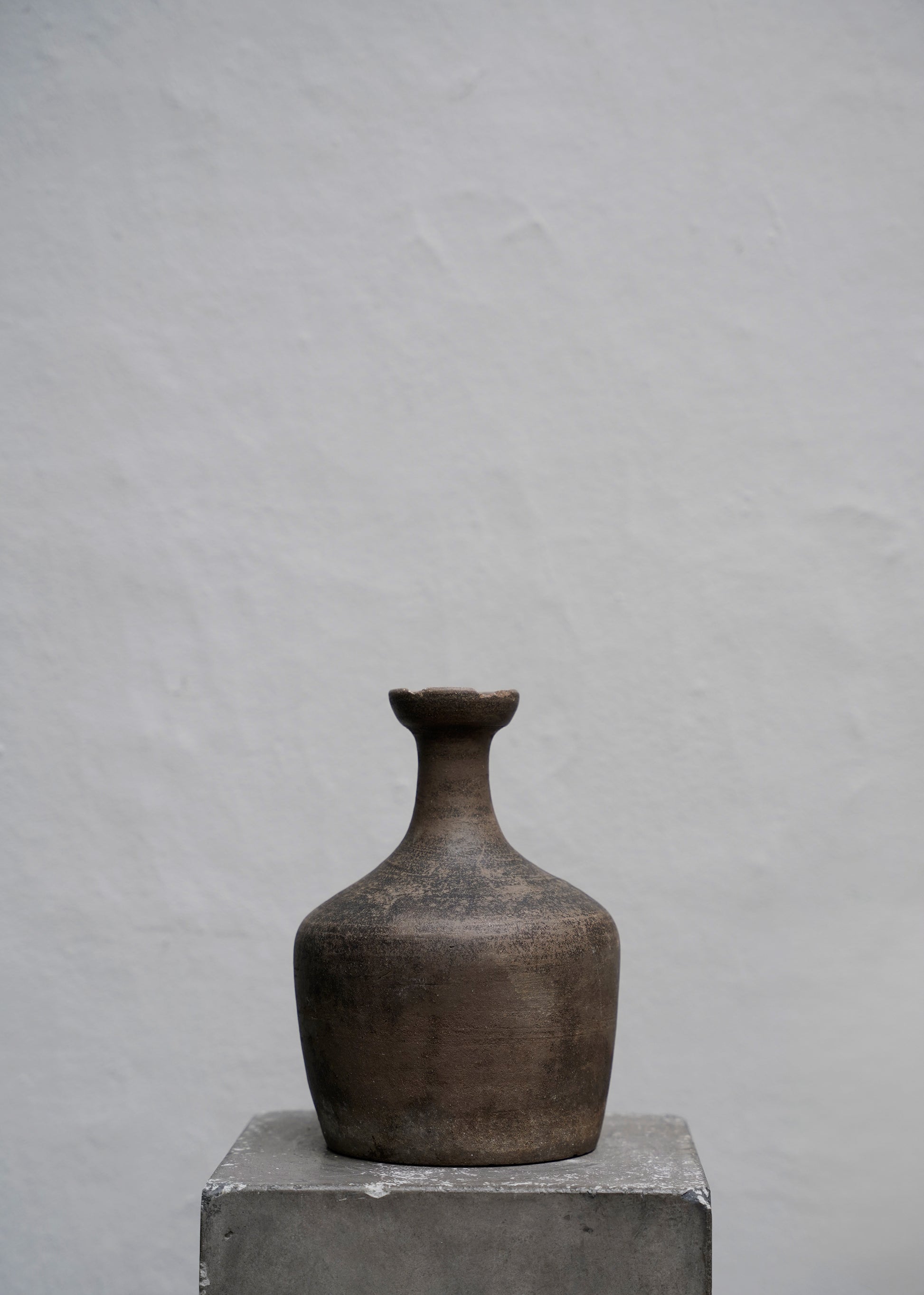 One of a kind old bottle in burned clay from Japan originally used for wine. The bottle has dark brown color with a beautiful patina.