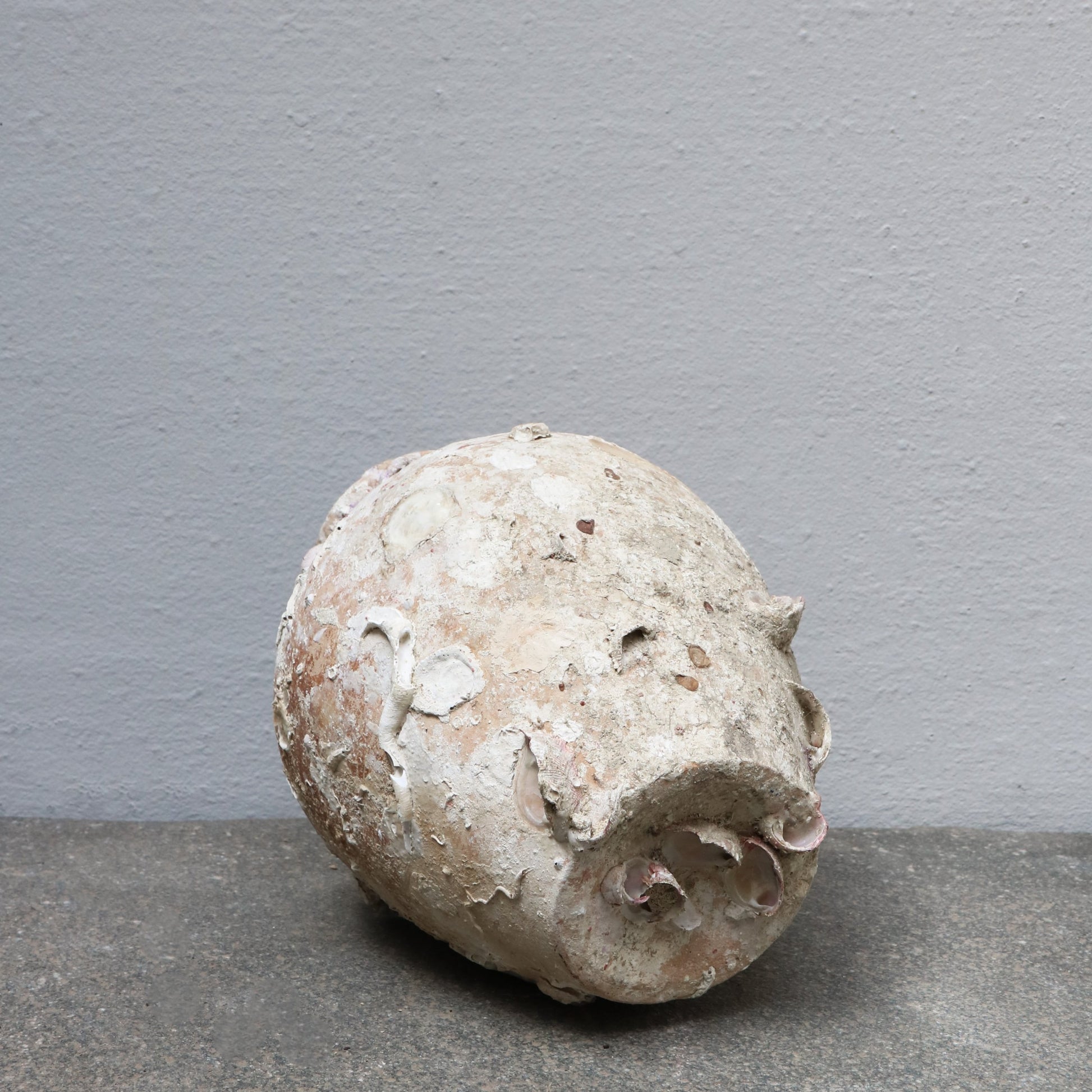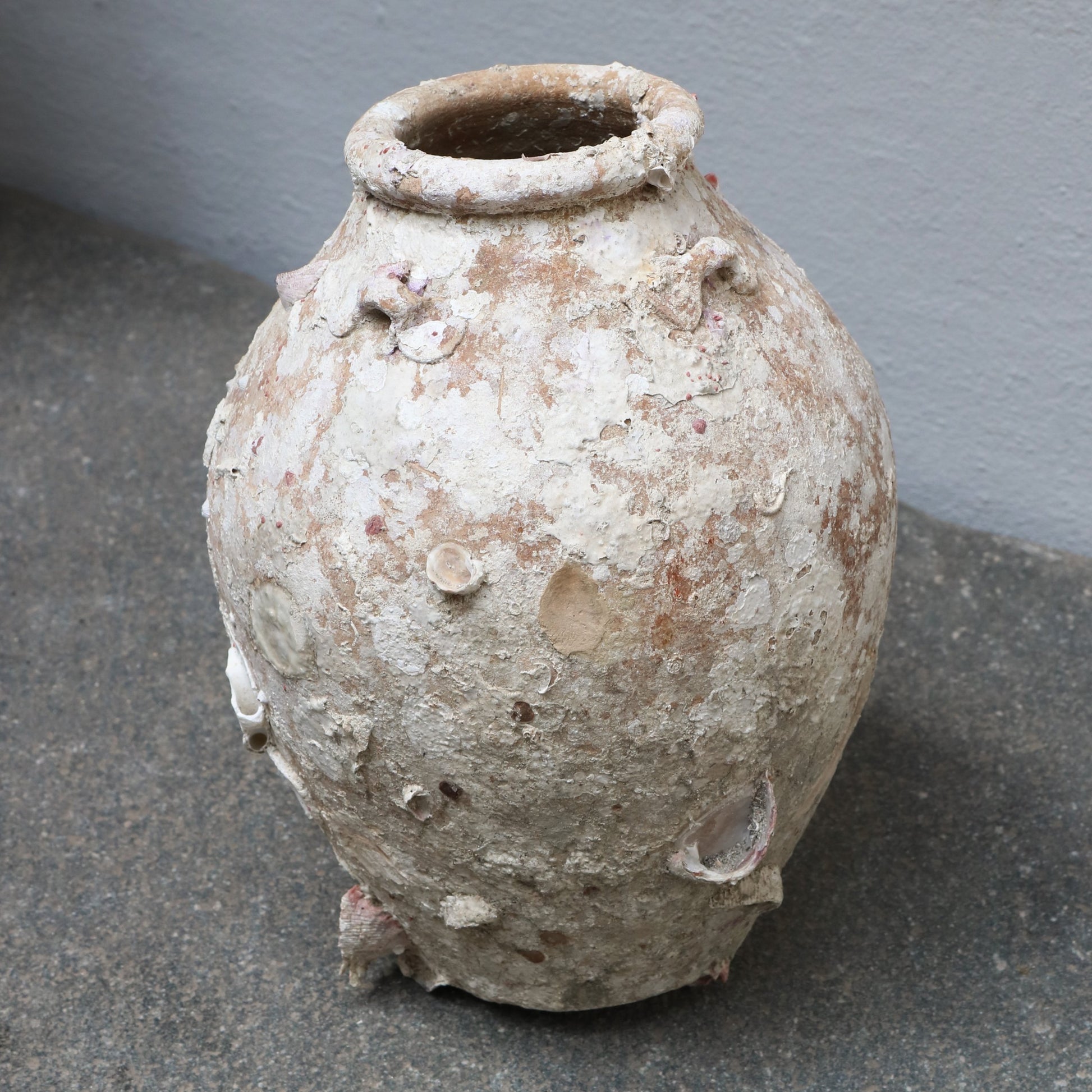 Antique jar excavated from a Chinese shipwreck. Over the time, at the bottom of the ocean, seashells have grown onto the beautiful jar.