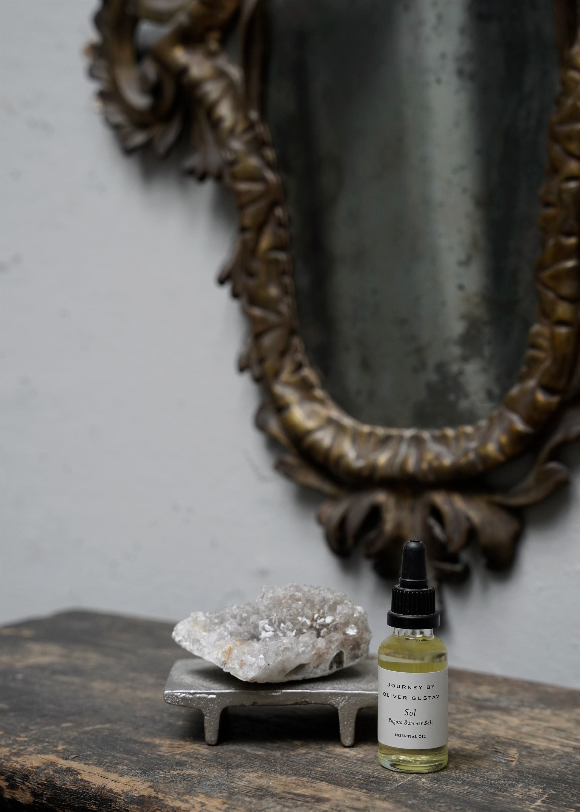 The Journey by Oliver Gustav Agate Crystal is placed on a silvery metal stand, enhancing the stone’s captivating shapes and delicate, translucent hues. The fine addition of drops of the accompanying Sol essential oil will infuse your rooms with a soft sense of serenity and freshness.
