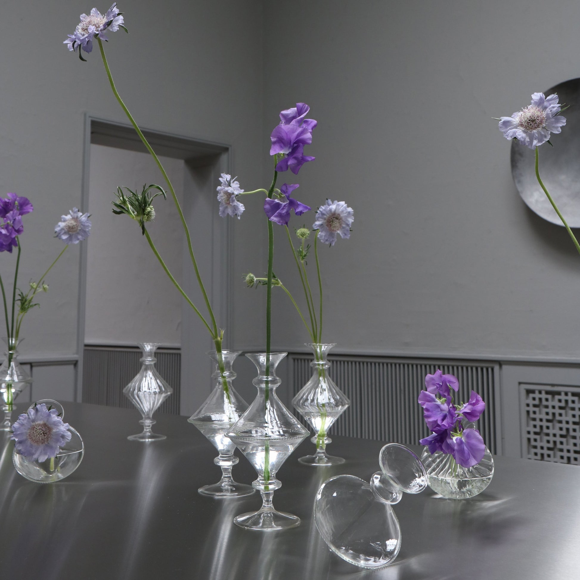 Beautiful mouth blown glass vase. The vase is pointy at the bottom which makes it tilt to the side instead of standing upright. The glass is lightweight and each piece is handmade with a twisted pattern. The size of the vase makes it perfect for just one small flower.